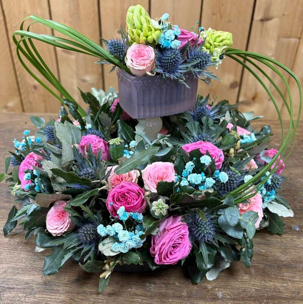 Laat je creativiteit bloeien en maak zelf een betoverend, romantisch bloemstuk. Met dit DIY-pakket creëer je een prachtig bloemstuk, sfeervol opgemaakt met distels, trosroosjes, steeneik, eucalyptus en gipskruid. Een liefdevolle eyecatcher voor in huis of om cadeau te geven Inhoud van het pakket: